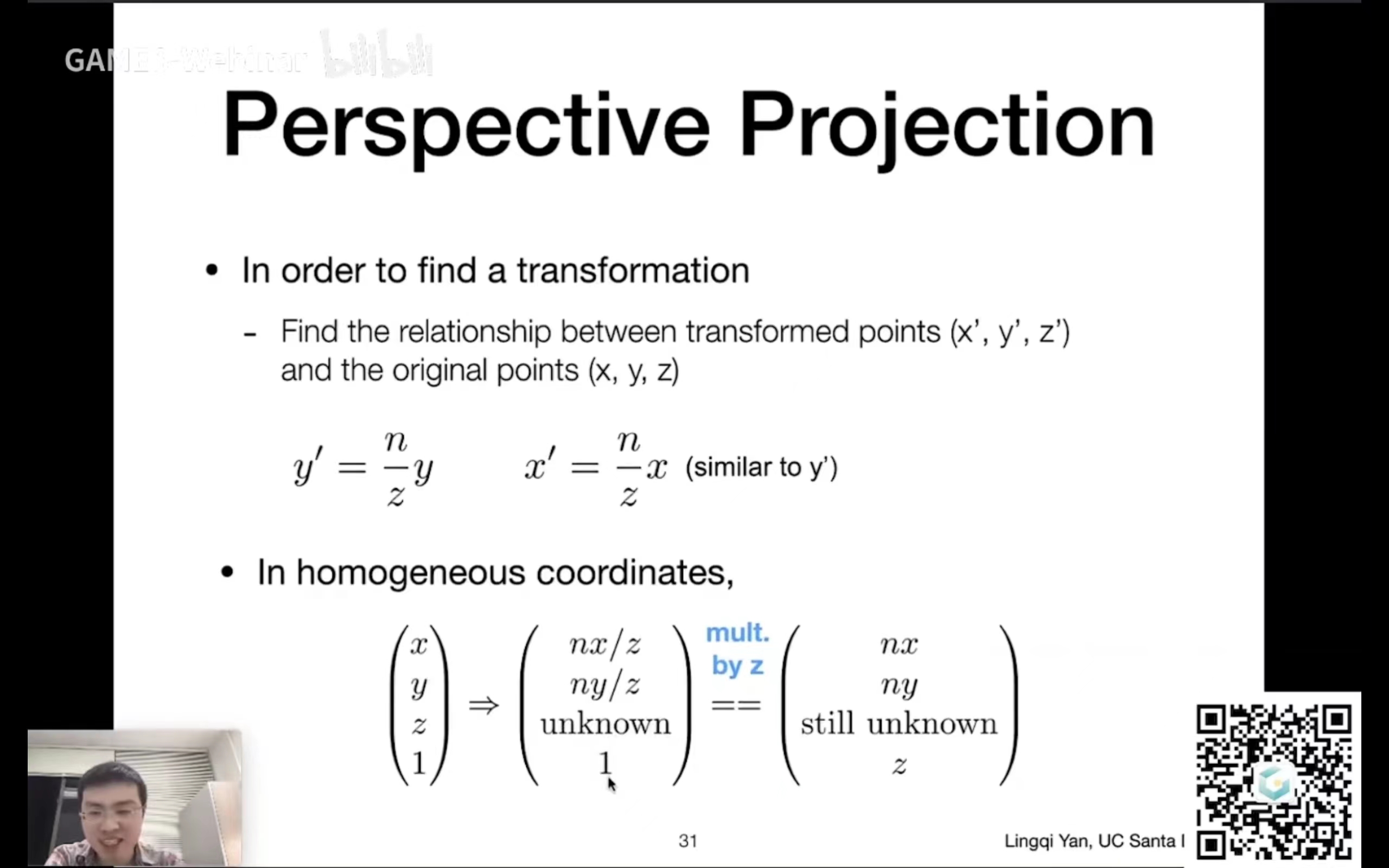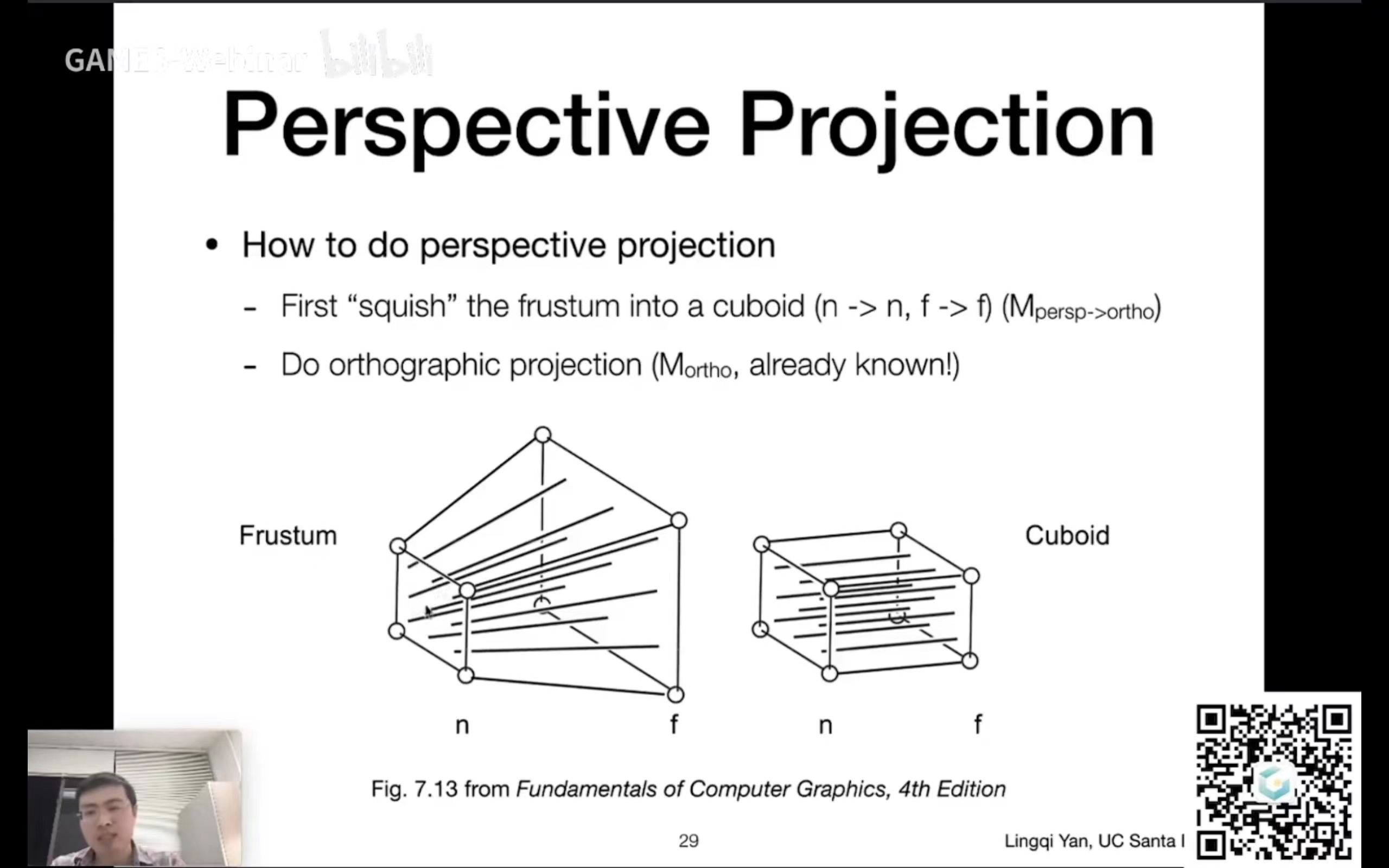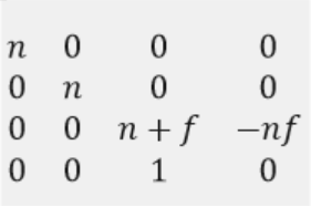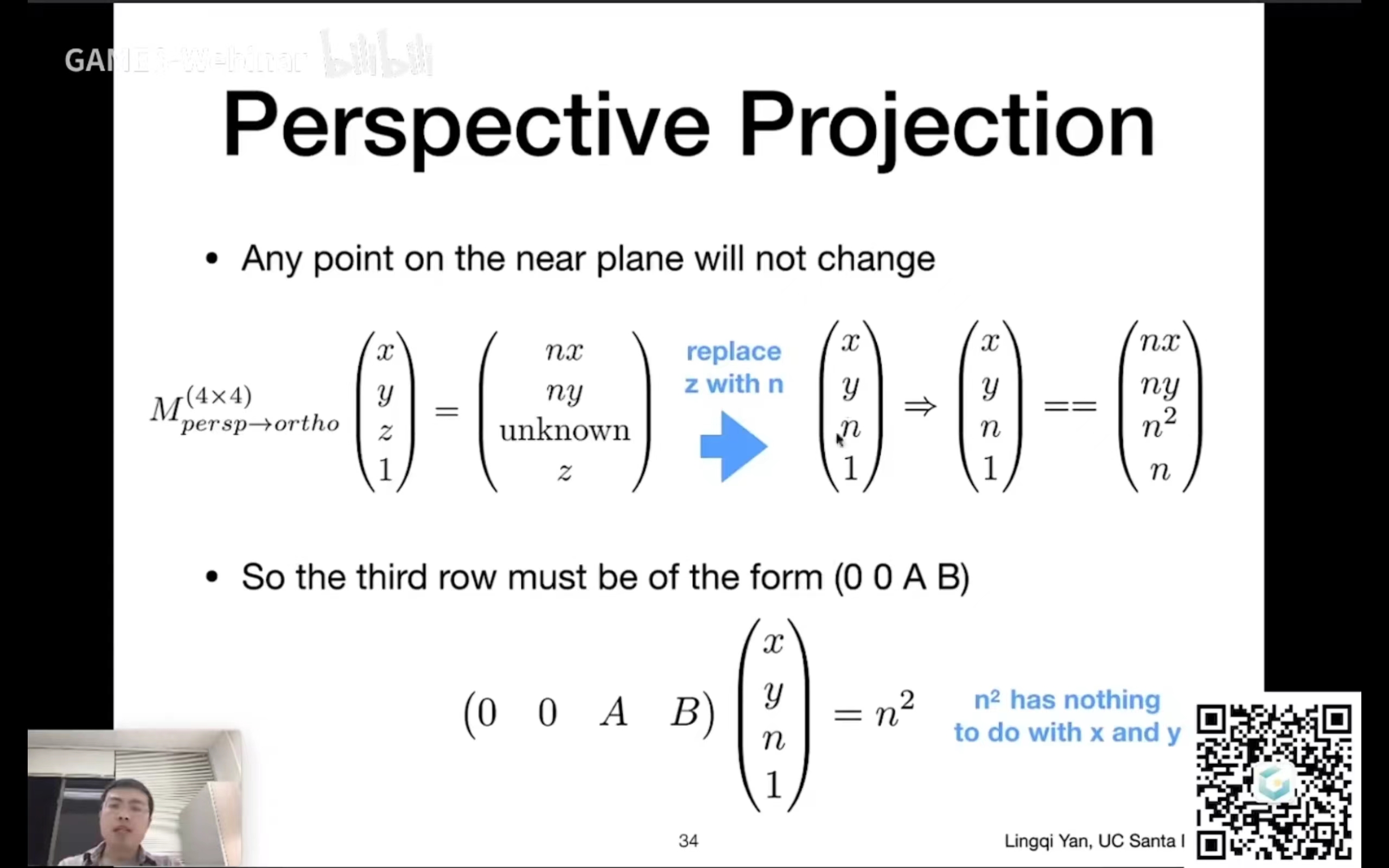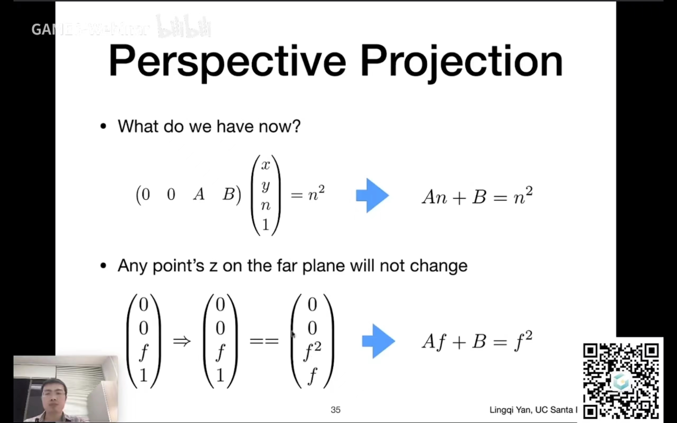 解方程后也能求出来最后的投影矩阵(还需要用 FOV 和长宽比进行参数替代)。