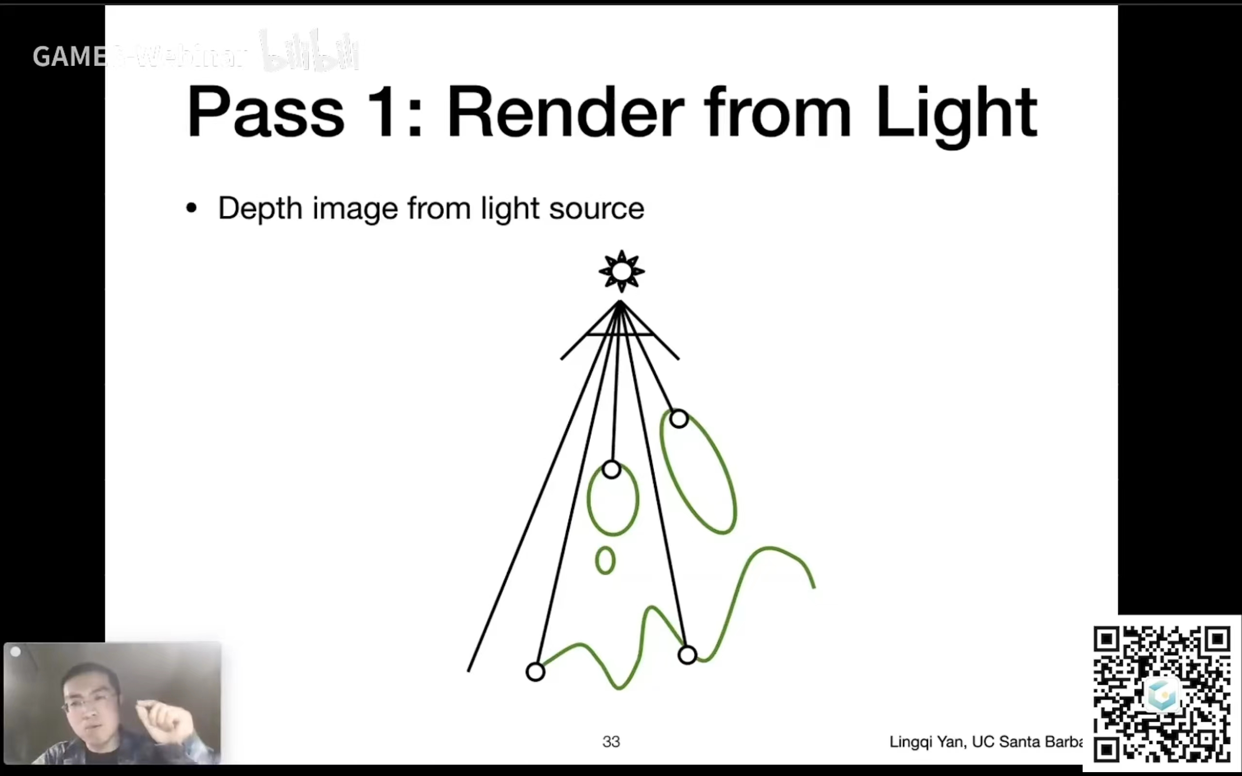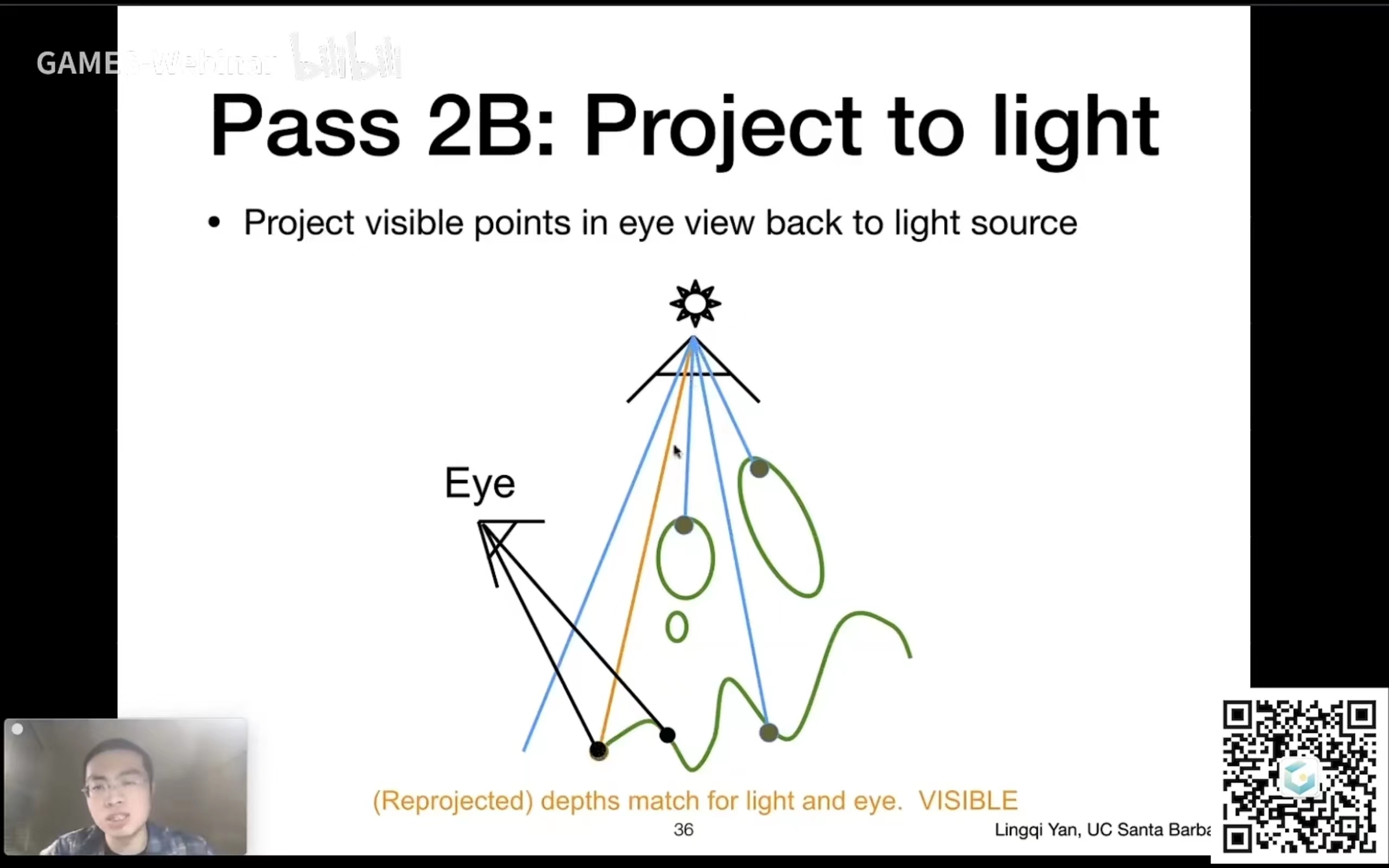 从光源看一遍并把深度值存下来,再从相机看一遍,深度一样就是可见。