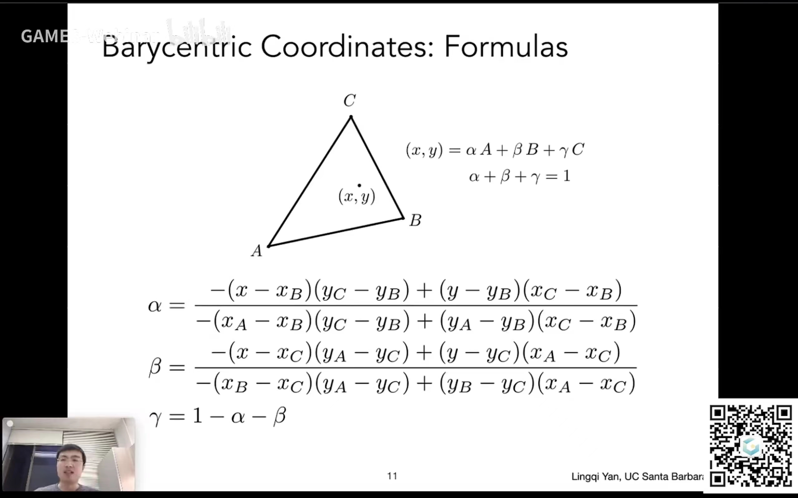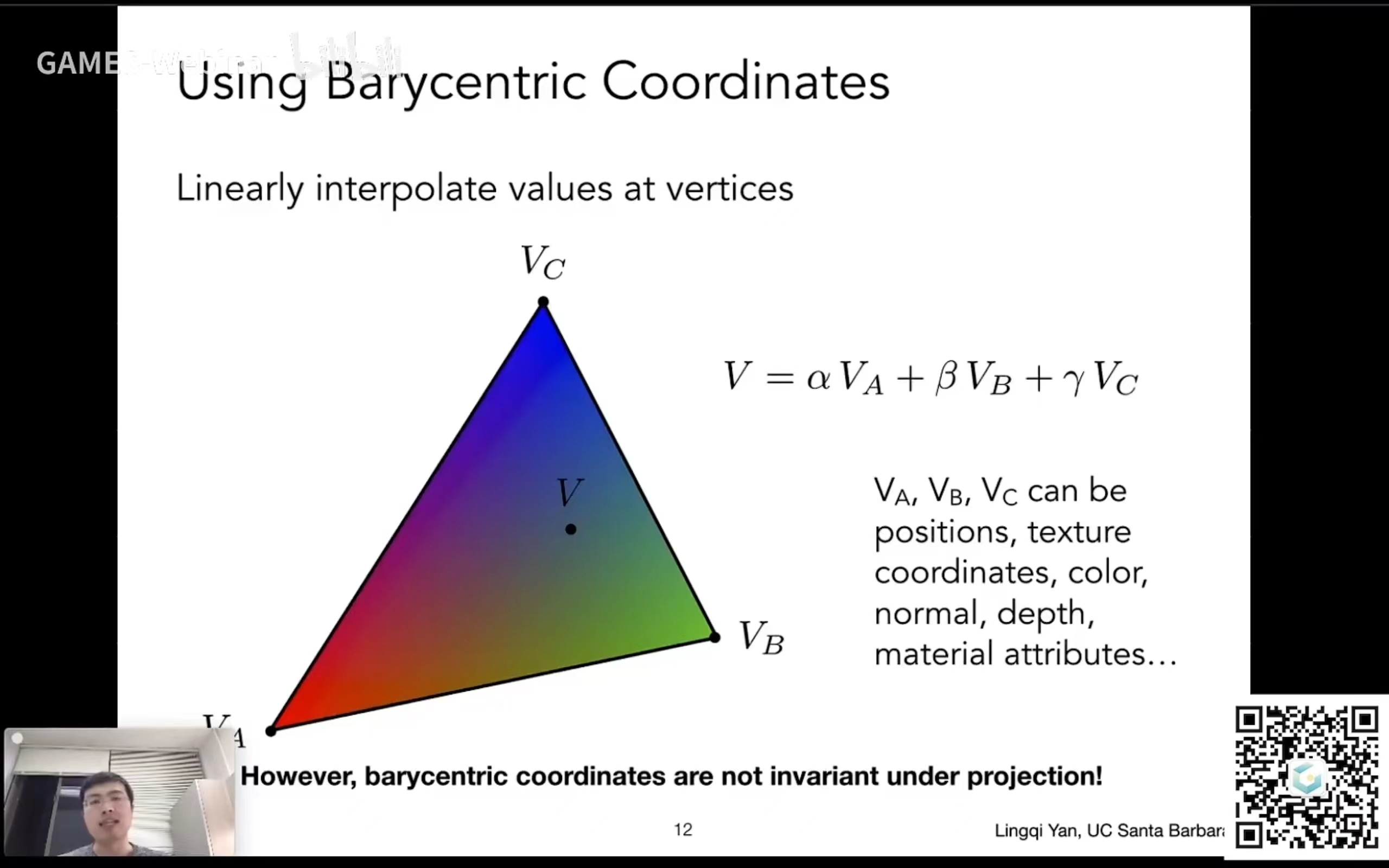 根绝贡献系数就可以实现纹理映射了,不过对于三维坐标(比如深度),就只能在三维空间内插值计算好后再映射到二维空间,因为重心从三维映射到二维后相对坐标会发生偏移。