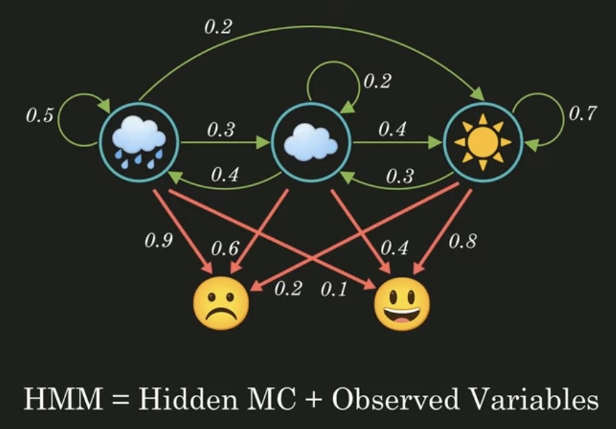 OK,那除此之外,在显式马尔可夫链中,我们是知道整个转移模型的(也就是上图的绿线),而在隐式马尔可夫链中我们只知道转移模型中的各状态对应传感器状态(也就是观察变量)的概率(也就是上图的红线)。