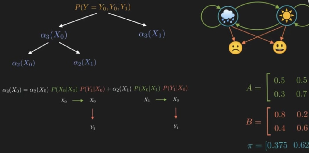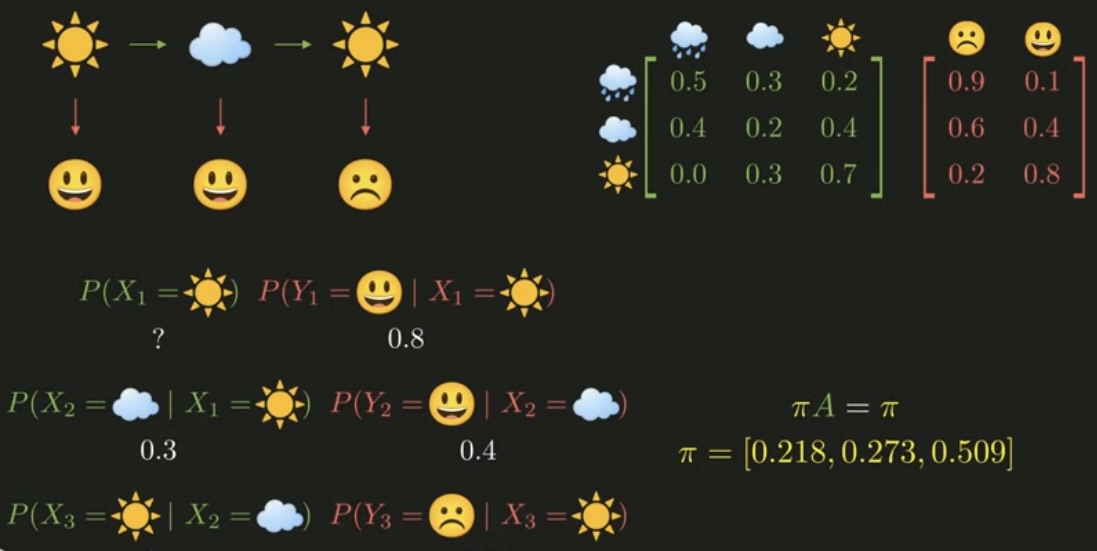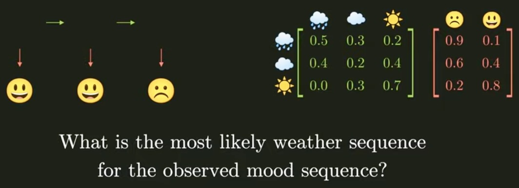 不过大部分情况,我们之所以要用隐式马尔可夫链是因为我们不知道显式的马尔可夫链 ,比如下图的问题,对于这样的 笑脸 -> 笑脸 -> 苦脸 的顺序,天气的顺序最有可能是怎么样的?概率又是多少呢?