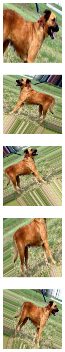 1 2 3 4 5 6 7 8 9 10 11 12 13 14 15 train_image_generator = ImageDataGenerator(rescale=1. /255 , rotation_range=45 , width_shift_range=.15 , height_shift_range=.15 , horizontal_flip=True , zoom_range=0.5 ) train_data_gen = train_image_generator.flow_from_directory(batch_size=batch_size, directory=train_dir, target_size=(IMG_HEIGHT, IMG_WIDTH), class_mode='binary' ) augmented_images = [train_data_gen[0 ][0 ][0 ] for i in range (5 )] plotImages(augmented_images)