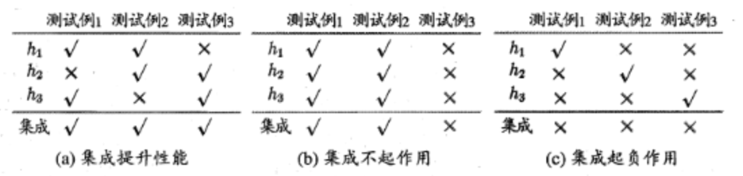 基于此,我们可以得出集成个体应该“好而不同“,如果大家不好就可能会是情况c,如果大家都好但是一样就可能会是情况b。